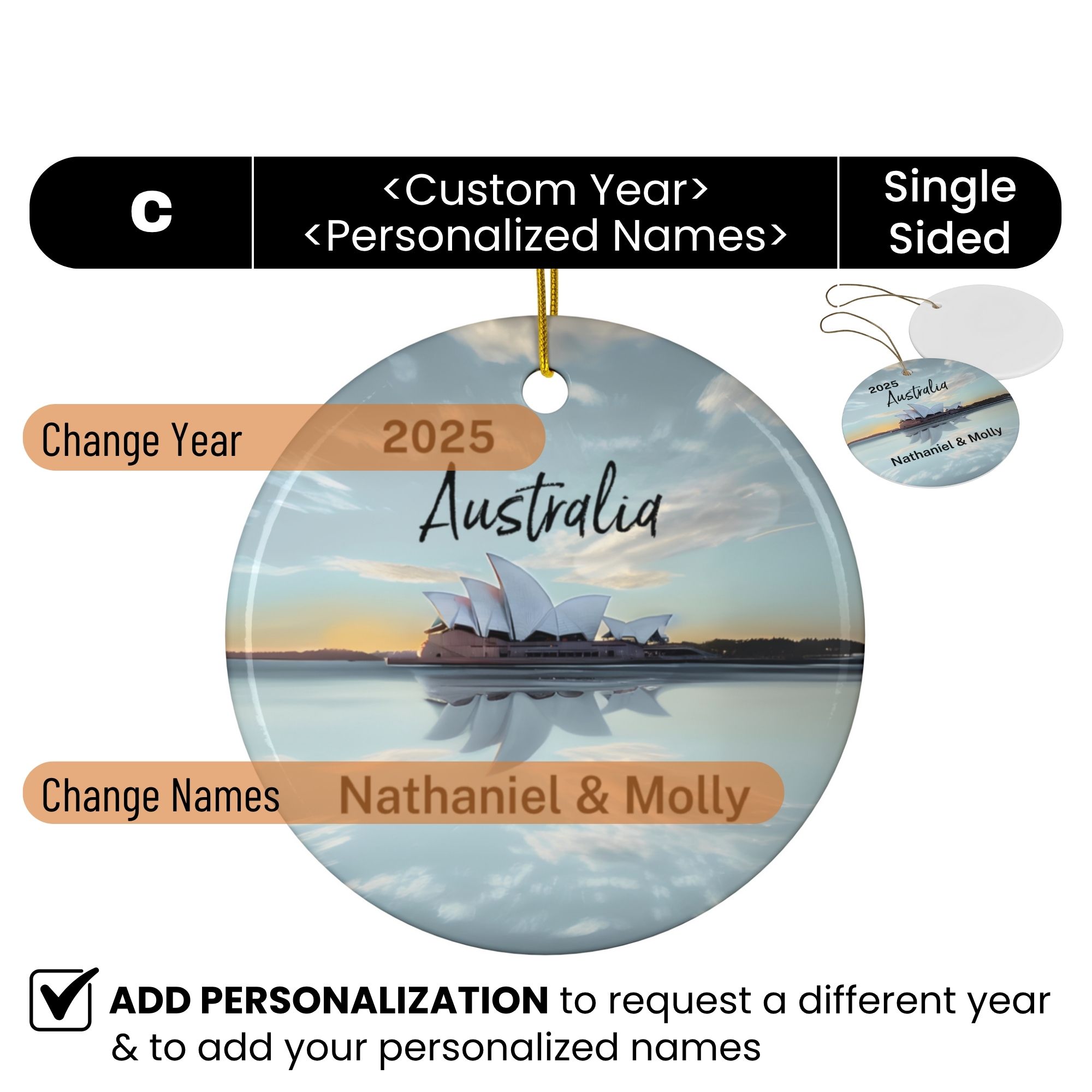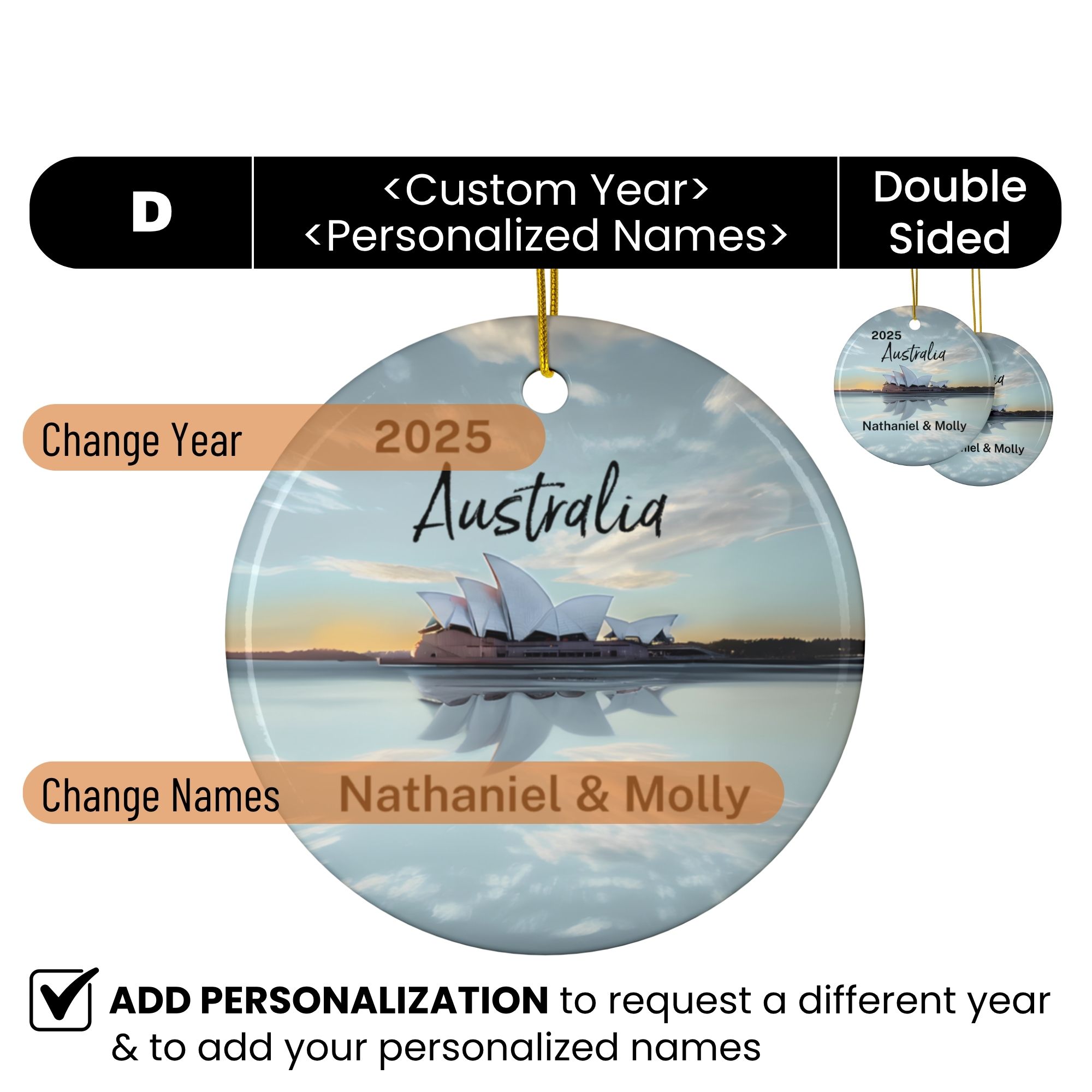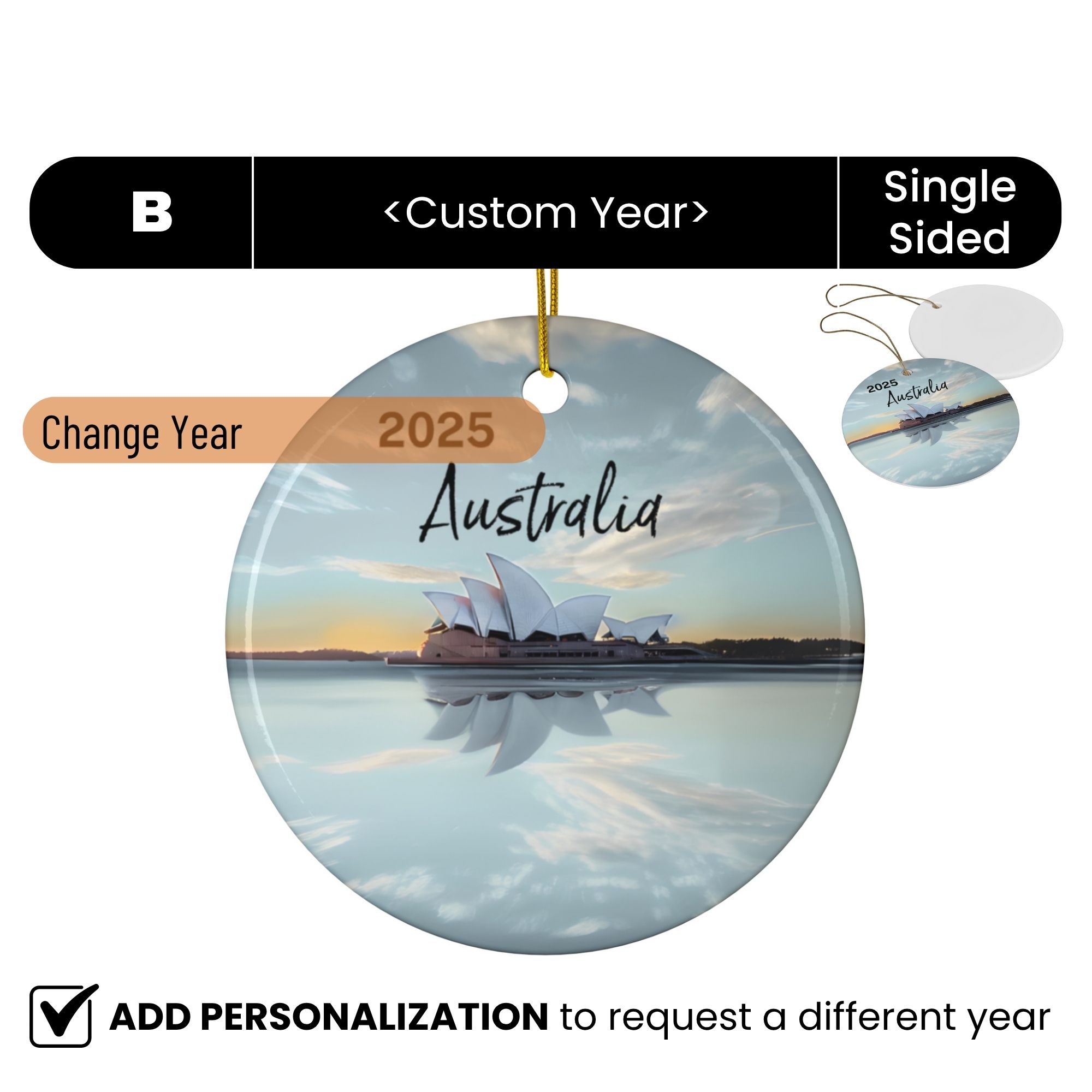 Celebrate your Australian adventure with this personalized travel ornament featuring the Sydney Opera House, one of the world’s most iconic landmarks. Capturing the Opera House’s distinctive sail-like shells set against the sparkling blue waters of Sydney Harbour, this keepsake will remind you of the stunning panoramic harbour views, a radiant reminder of city lights, coastal charm, and the spirit of discovery that defines your journey Down Under.