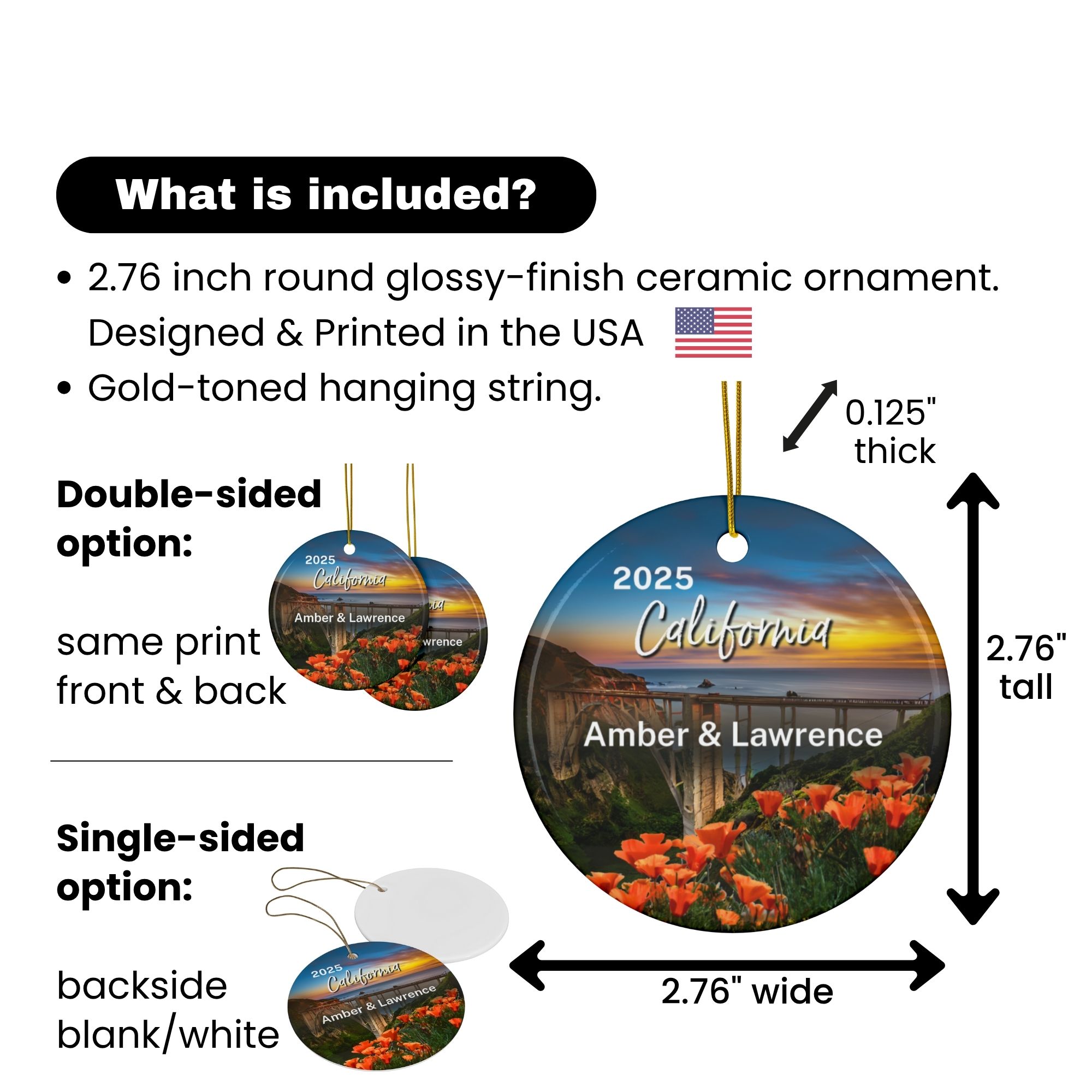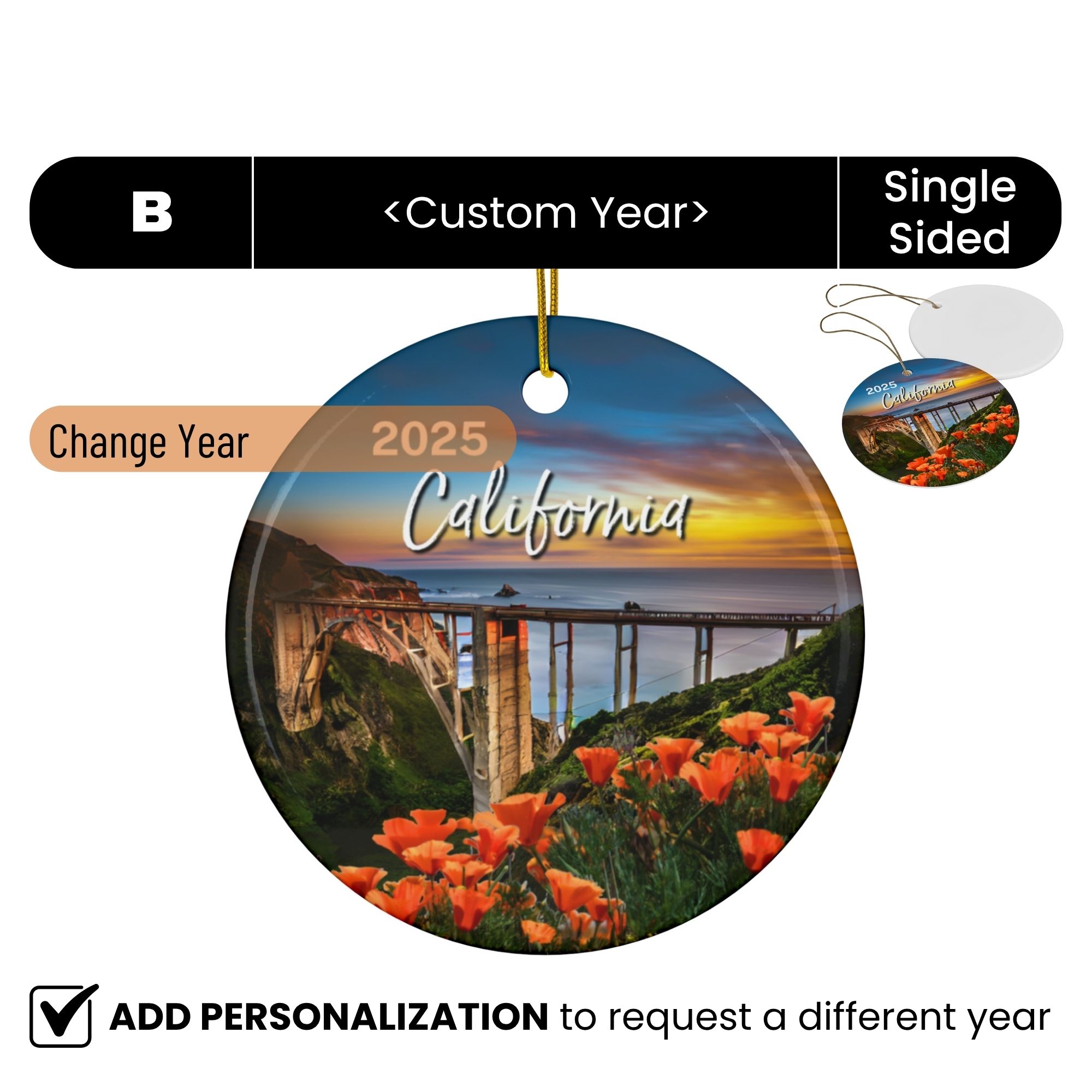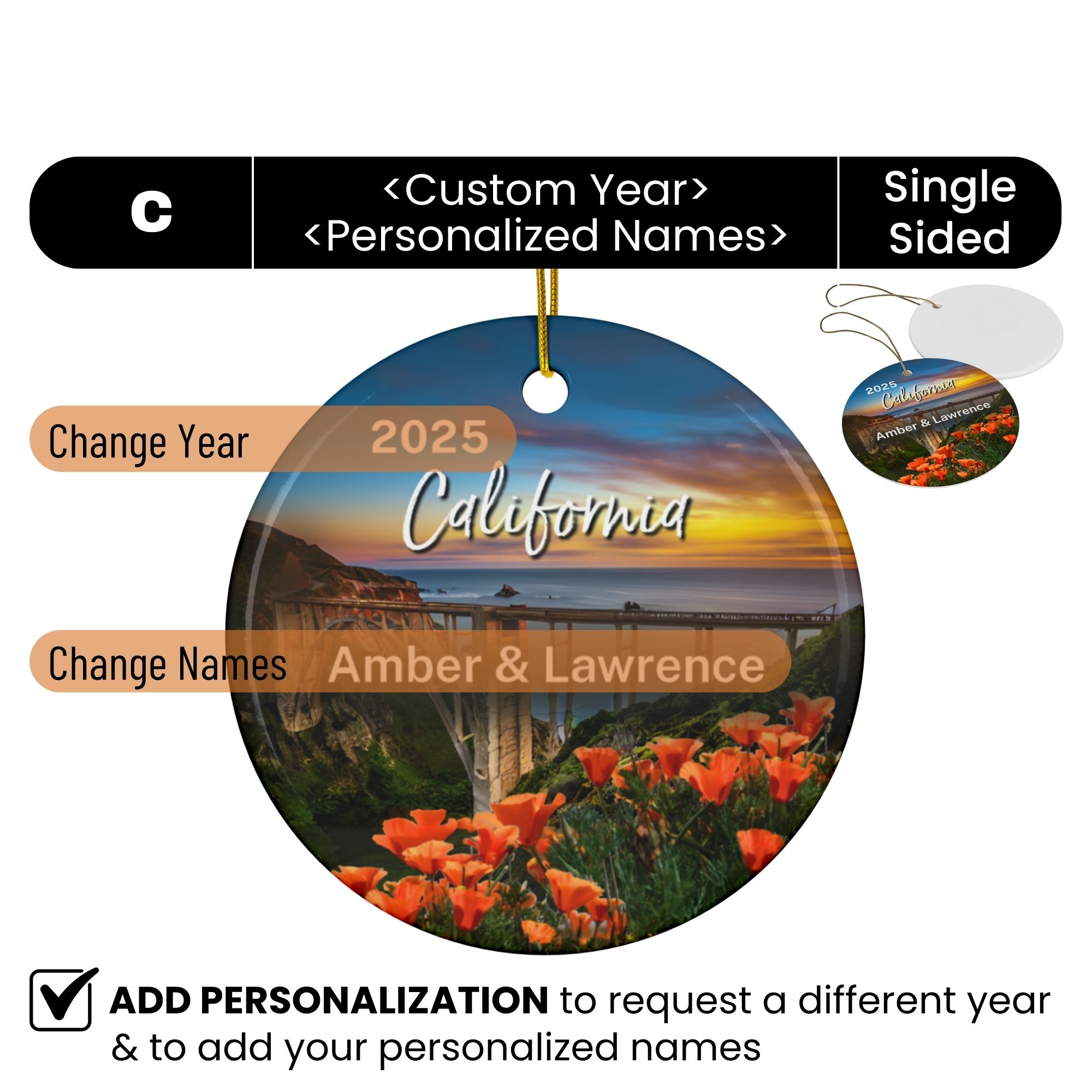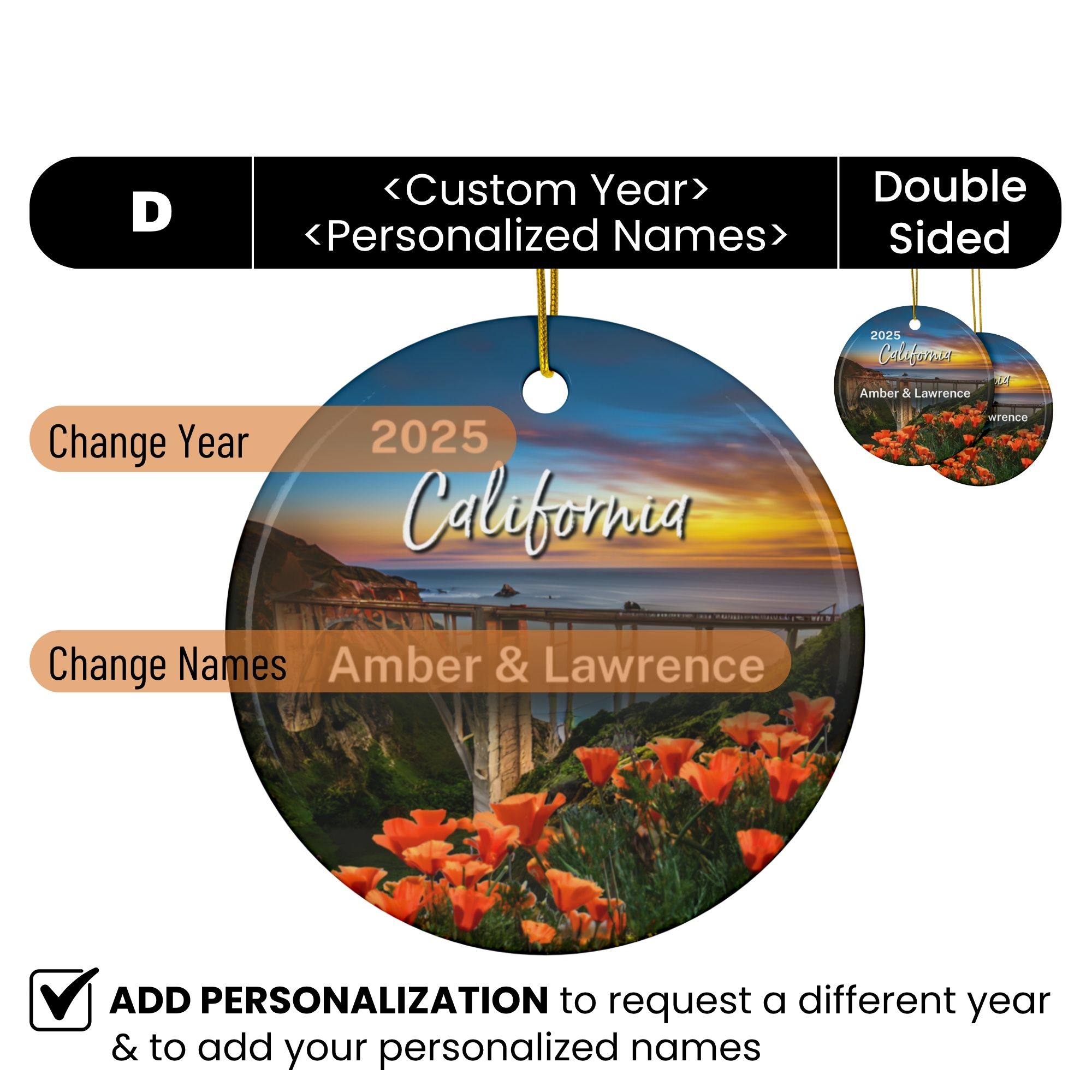 California Poppy Ornament: Double-Sided + Year + Personalization