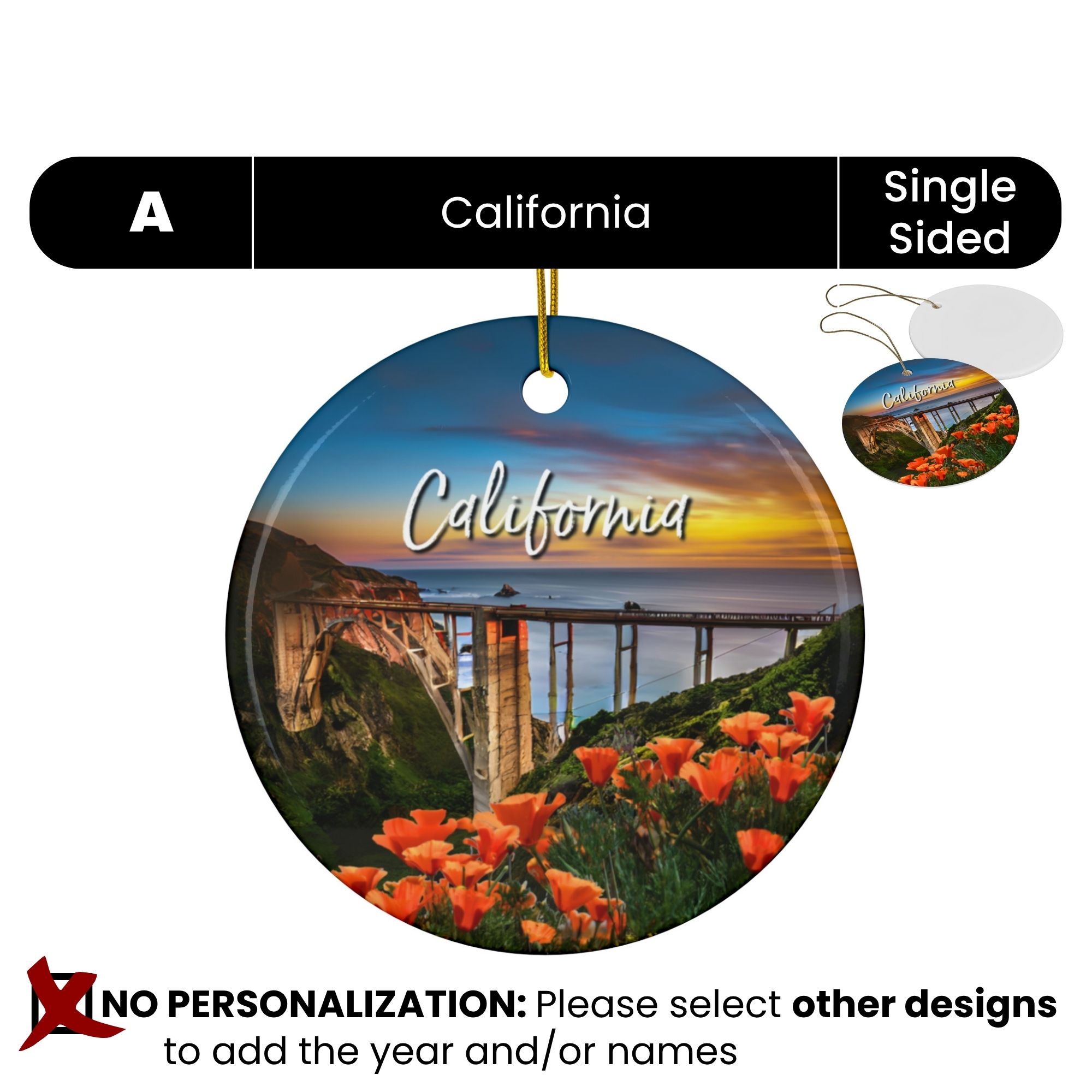 Remember your California adventure with a personalized Christmas ornament featuring the breathtaking Pacific Coast Highway road trip, showcasing the iconic Bixby Creek Bridge gracefully spanning rugged coastal cliffs. Capture the vibrant beauty of blooming California poppies carpeting rolling hillsides under wide blue skies, alongside stunning ocean views and winding coastal roads that define this unforgettable journey along the Golden State’s scenic coastline.