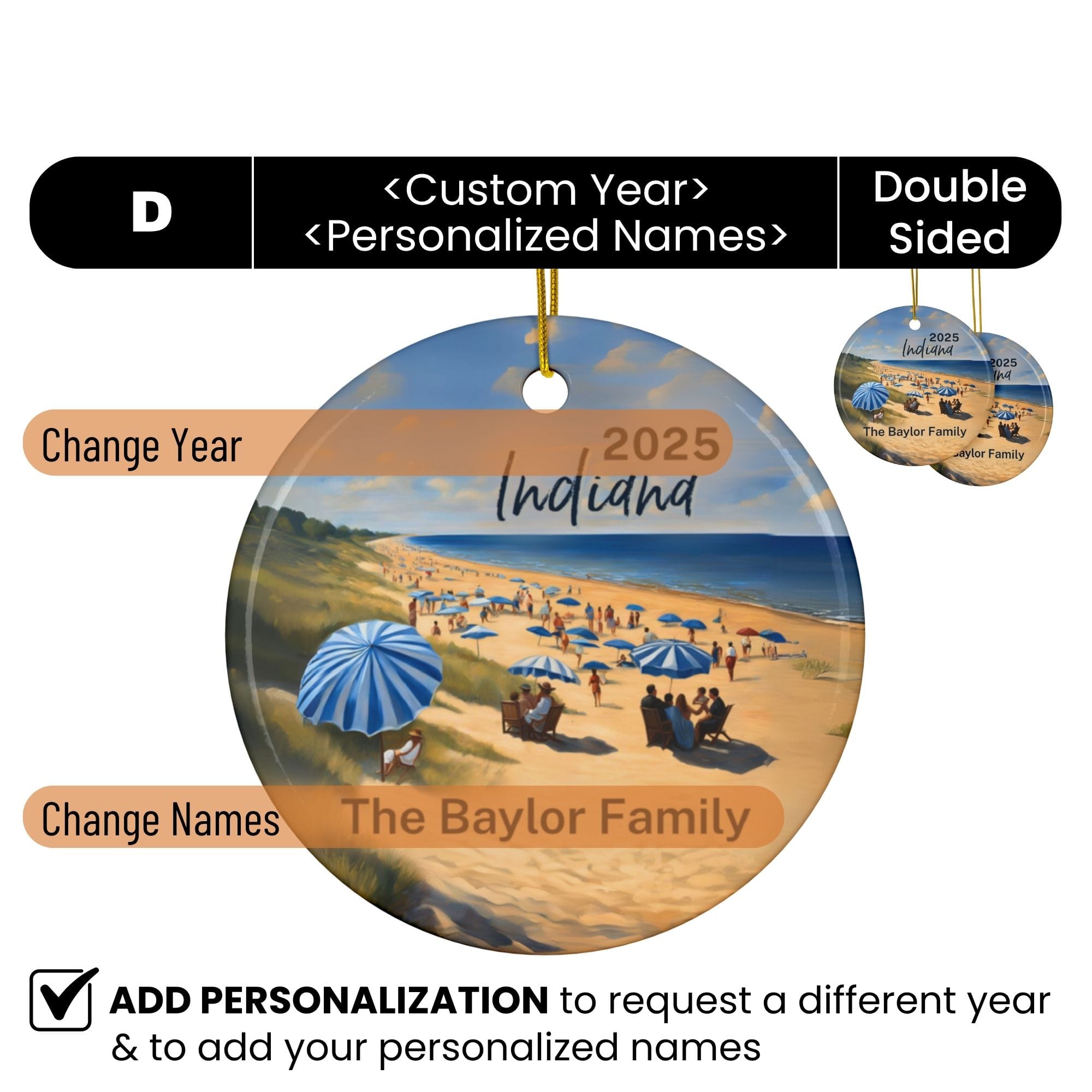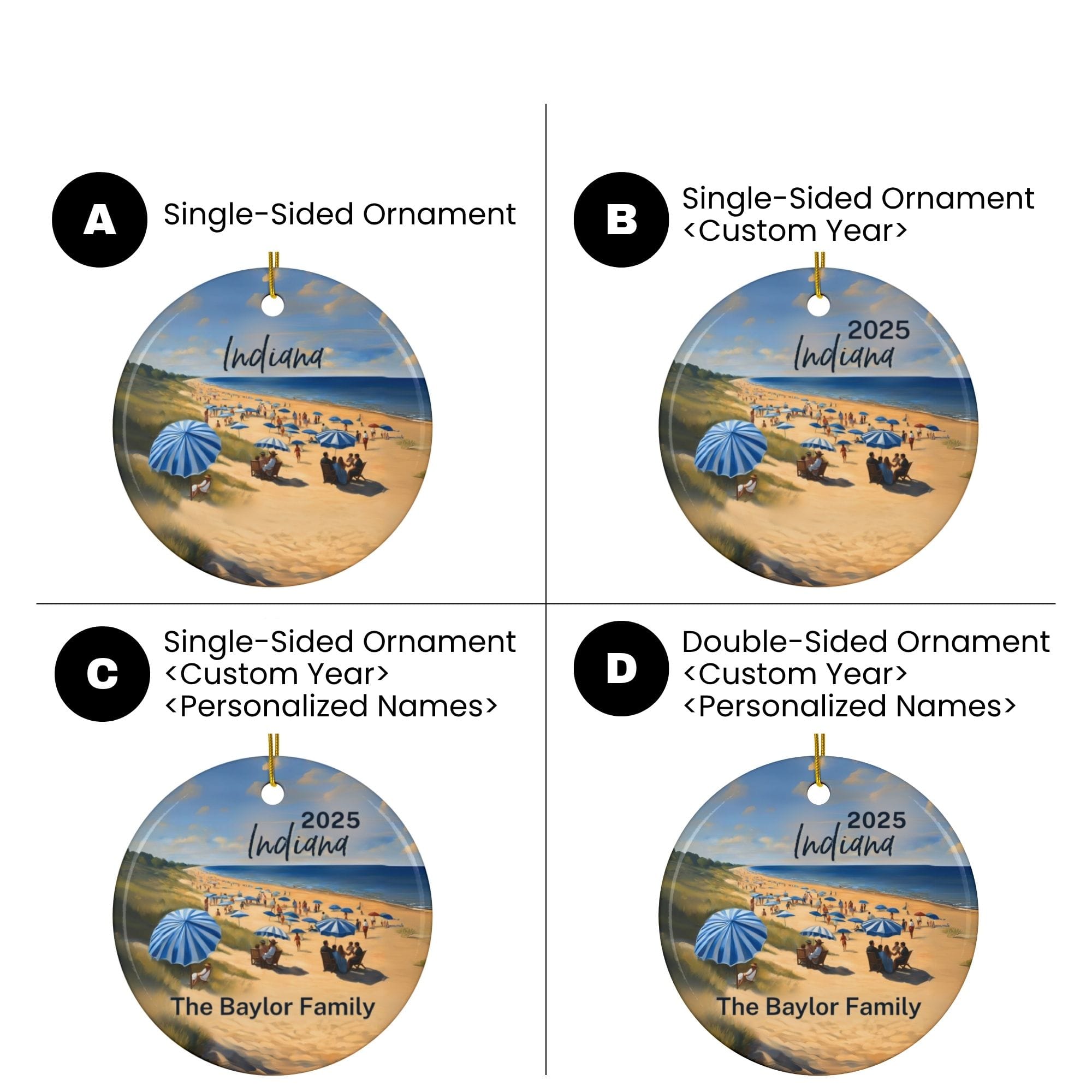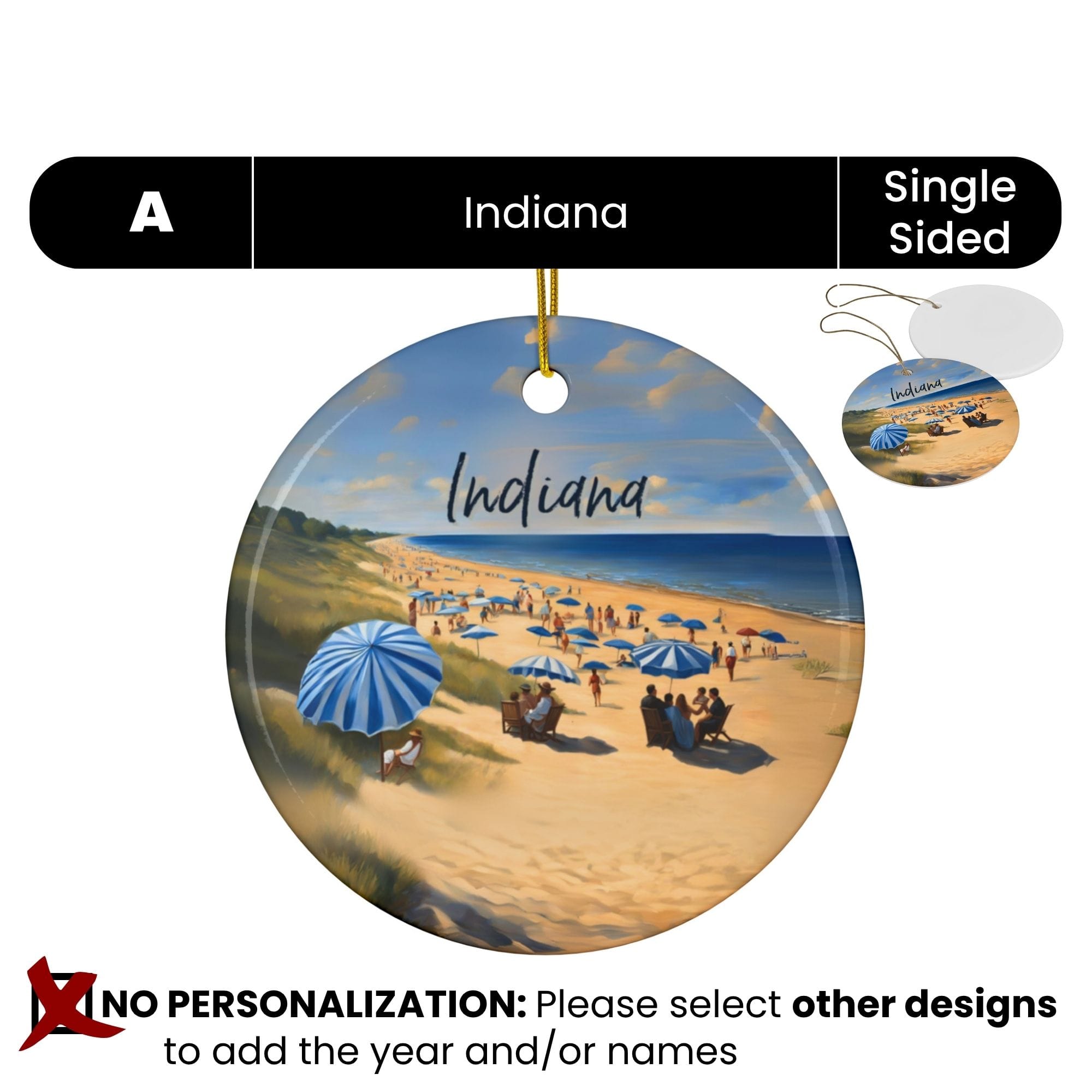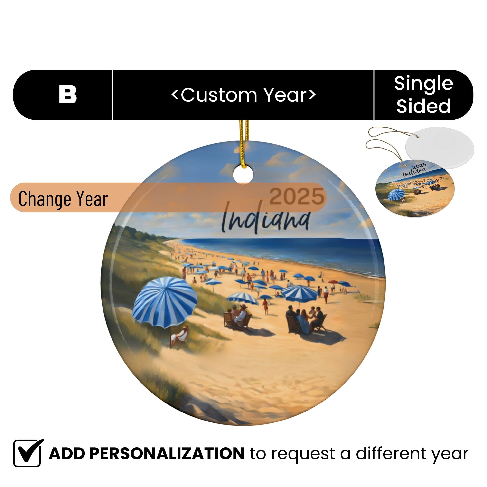 Remember your Indiana adventure with a personalized Christmas ornament featuring the stunning 15 miles of sandy beaches along Lake Michigan’s southern shore at Indiana Dunes National Park and State Park. Capture iconic spots like West Beach, Portage Lakefront, and Kemil Beach, framed by towering sand dunes, vibrant prairies, and lush forests—celebrating the diverse natural beauty and endless lakeside adventures of Indiana’s shoreline.