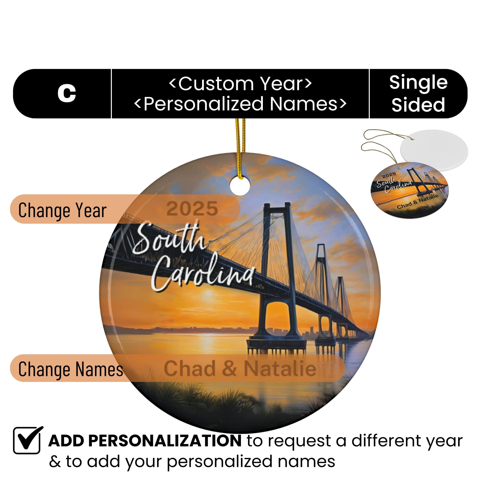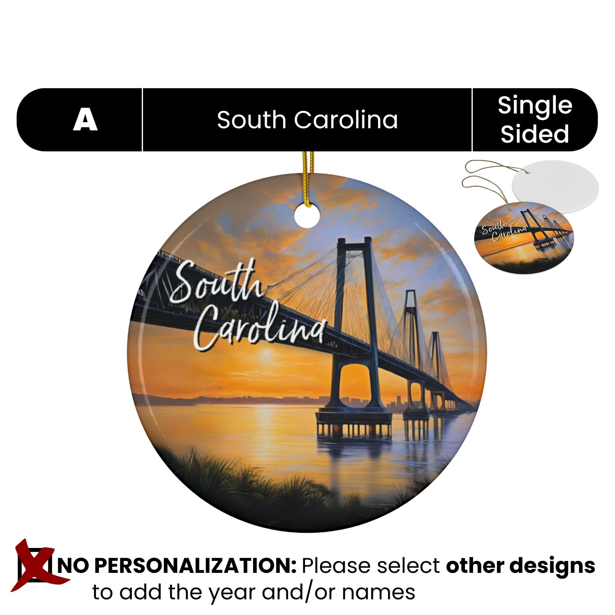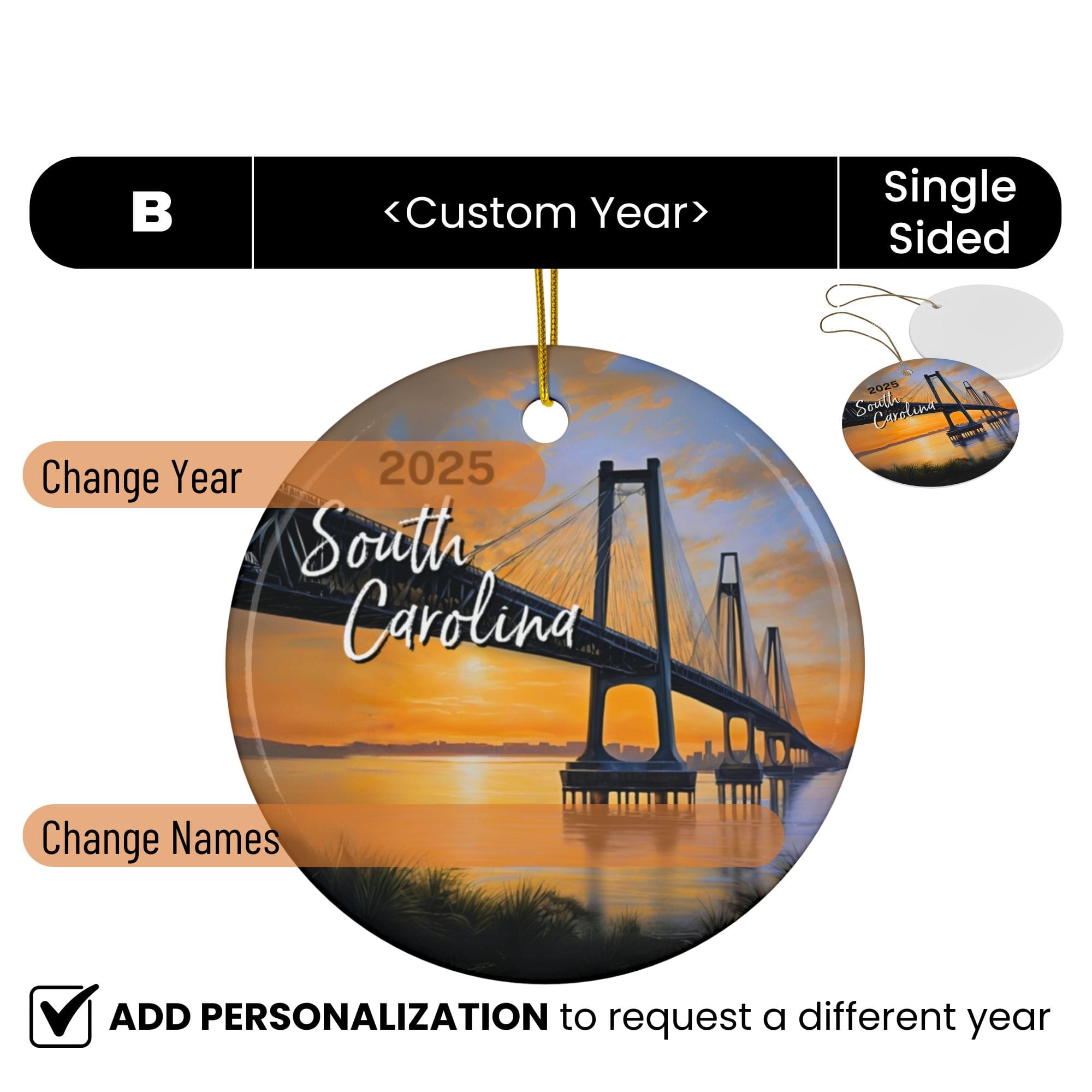 Remember your South Carolina adventure with a personalized Christmas ornament featuring the iconic Arthur Ravenel Jr. Bridge spanning Charleston’s Cooper River, alongside the state’s natural wonders and scenic kayaking spots.