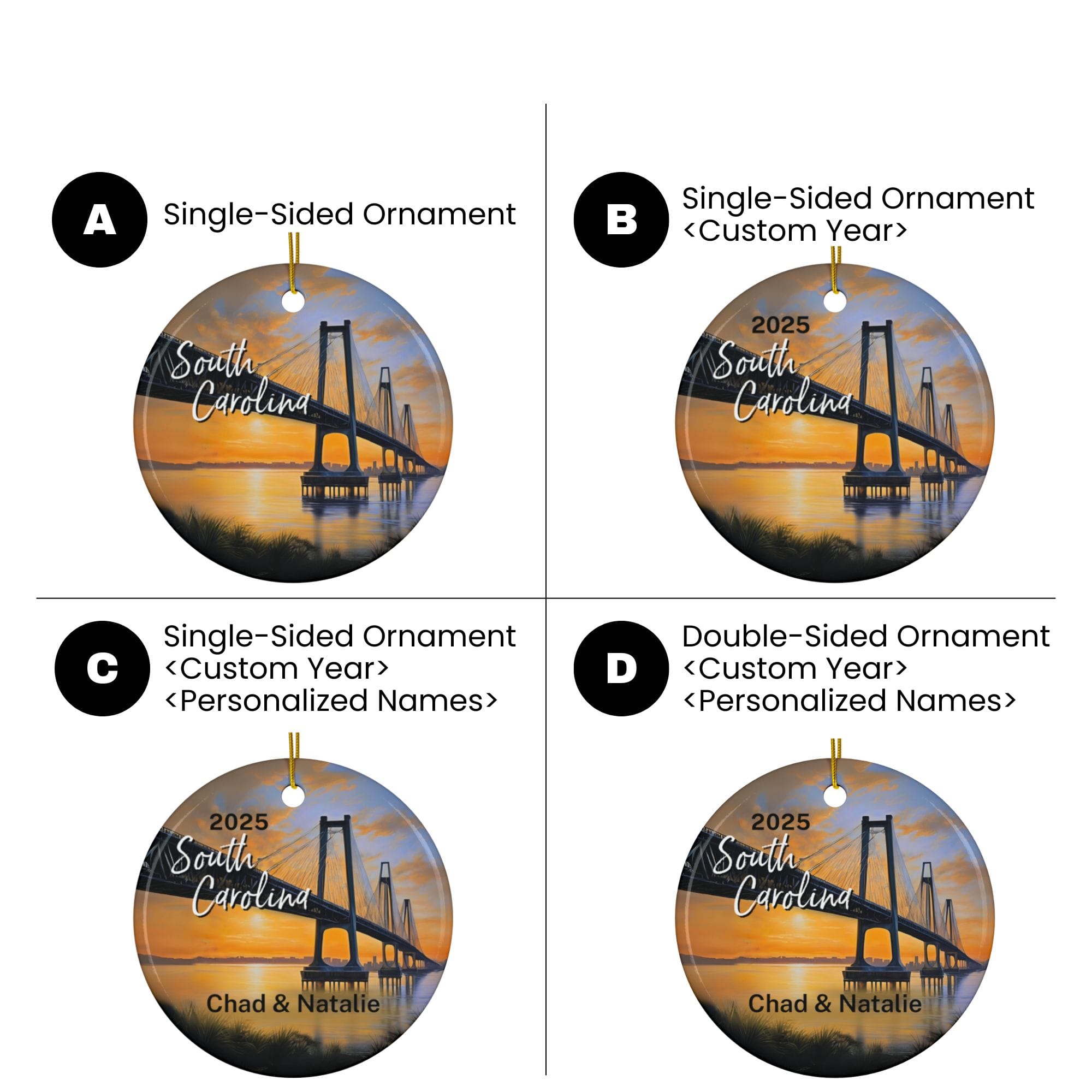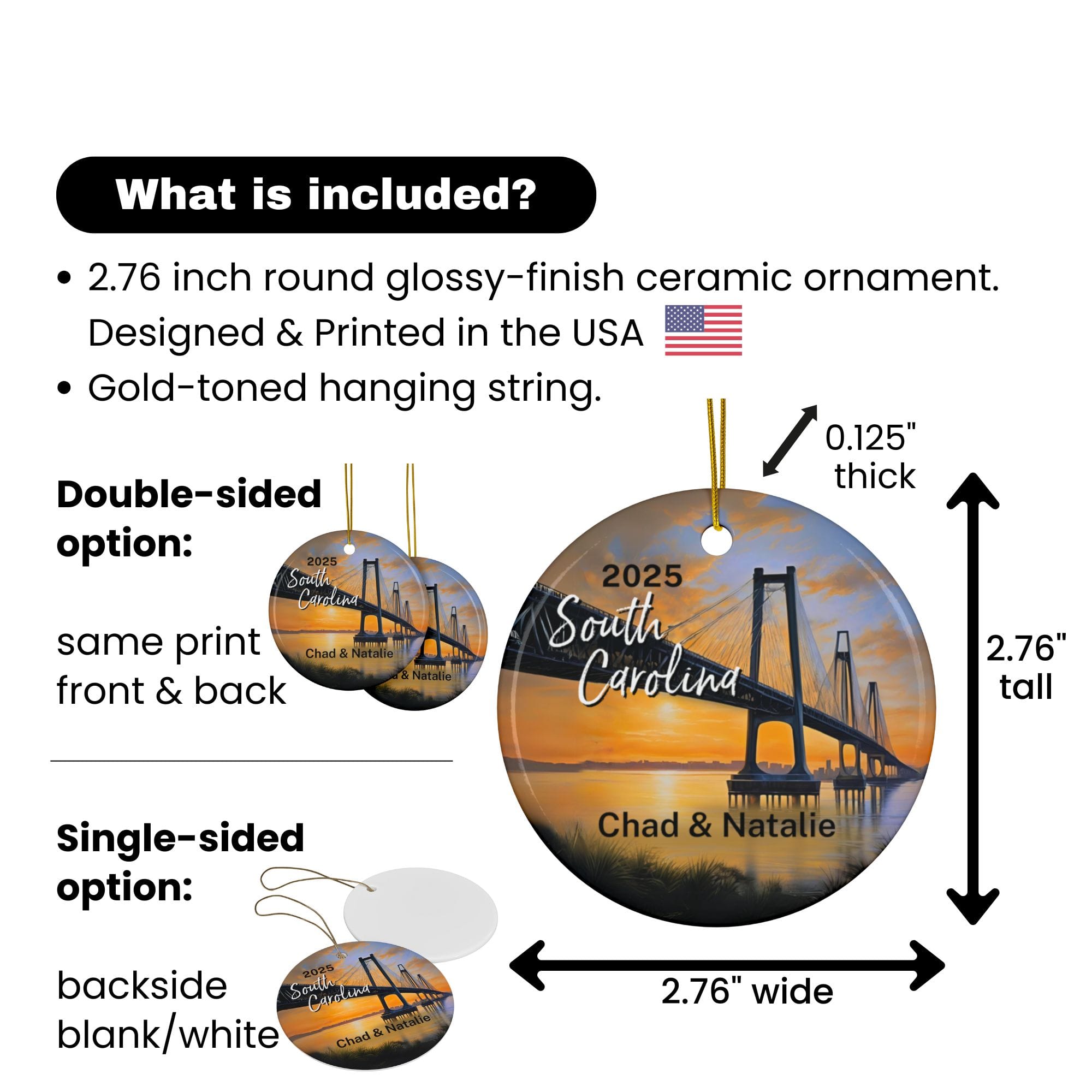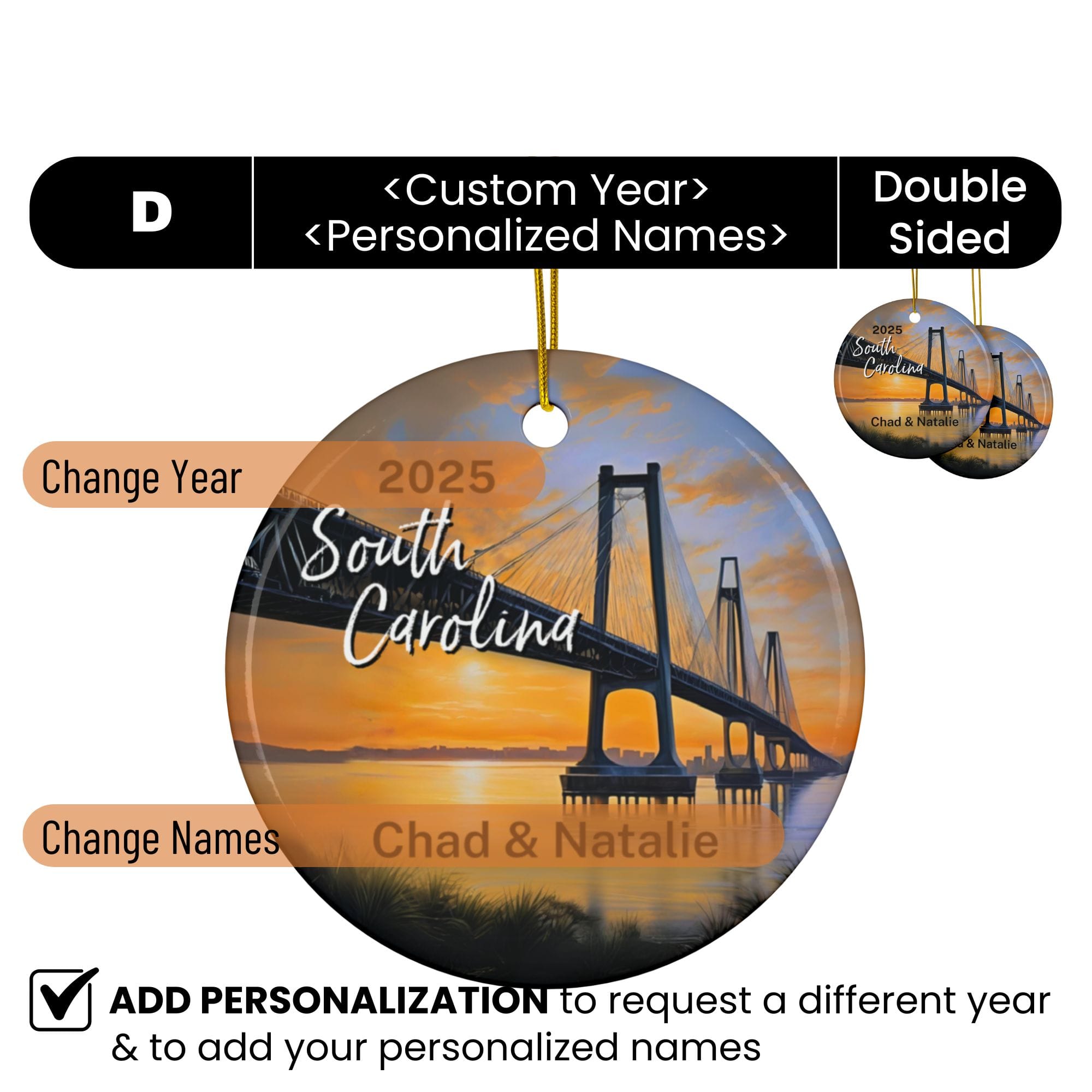 Remember your South Carolina adventure with a personalized Christmas ornament featuring the iconic Arthur Ravenel Jr. Bridge spanning Charleston’s Cooper River, alongside the state’s natural wonders and scenic kayaking spots.